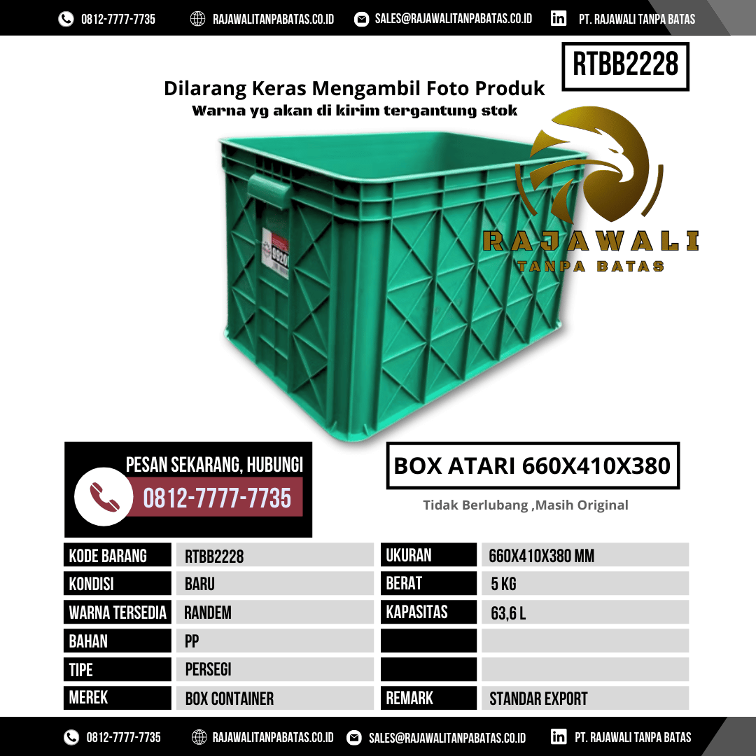 Untuk informasi lebih lanjut mengenai harga, ketersediaan, atau pemesanan Box Kontainer RTBB2228 Kapasitas 63,6 Liter, silakan hubungi tim sales PT Rajawali Tanpa Batas melalui WhatsApp 0812-7777-7735 atau email sales@rajawalitanpabatas.co.id