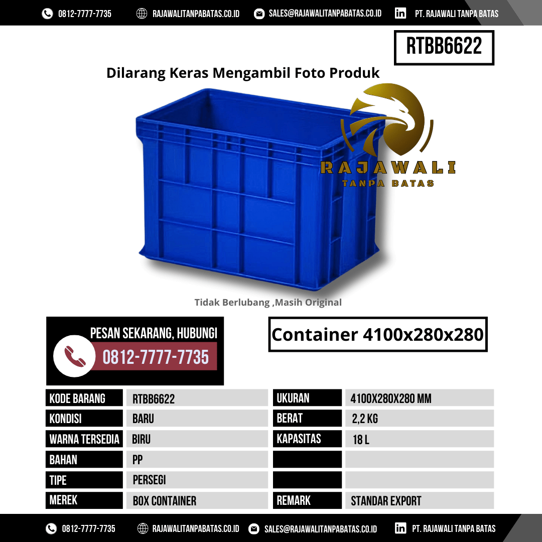 PT Rajawali Tanpa Batas menghadirkan solusi penyimpanan yang andal dan efisien melalui Box Kontainer Baru RTBB6622, produk unggulan yang dirancang untuk memenuhi kebutuhan industri, pergudangan, distribusi, dan bisnis skala menengah hingga besar. Dengan ukuran 4100x280x280 mm dan kapasitas 18 liter, kontainer ini ideal untuk menyimpan berbagai jenis barang secara rapi dan aman, mulai dari bahan baku, komponen industri, hingga produk jadi siap distribusi.
