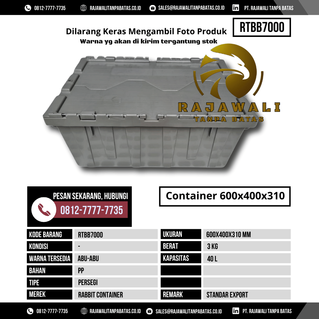 Untuk informasi harga terbaru, ketersediaan stok, dan pemesanan Box Kontainer RTBB7000, silakan hubungi tim PT Rajawali Tanpa Batas melalui: