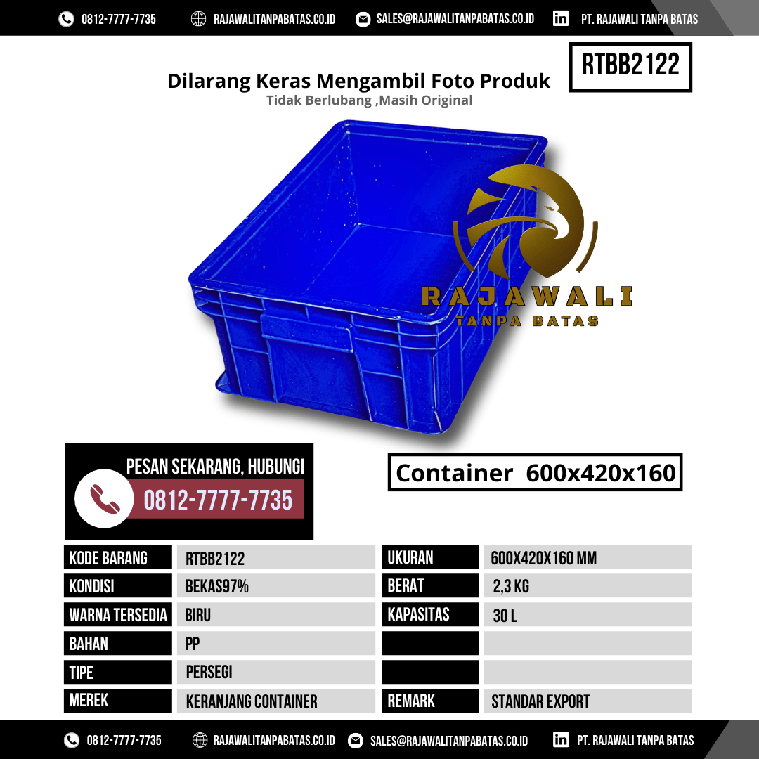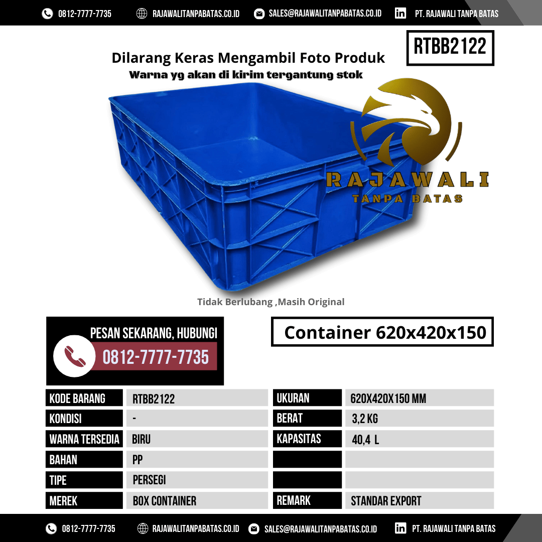 Untuk informasi harga, ketersediaan stok, dan pemesanan Box Kontainer RTBB2122, silakan hubungi tim sales PT Rajawali Tanpa Batas melalui: