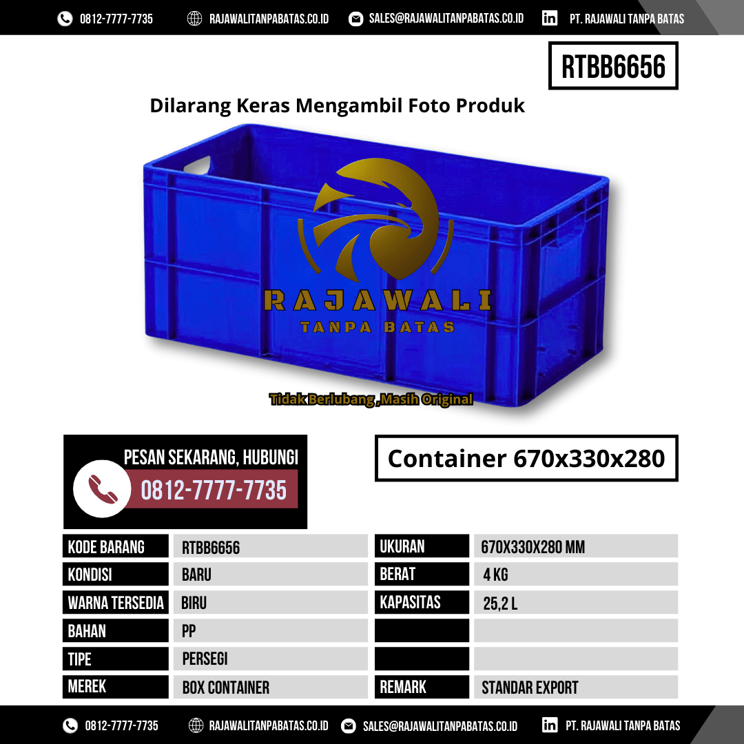 Memilih Box Kontainer RTBB6656 berarti berinvestasi pada media penyimpanan yang praktis, tahan lama, higienis, dan efisien. Produk ini bukan sekadar wadah penyimpanan, tetapi solusi strategis untuk meningkatkan efektivitas, keamanan, dan produktivitas operasional gudang maupun distribusi barang. Dengan kualitas terjamin, standar export, dan harga bersaing, RTBB6656 adalah pilihan tepat bagi perusahaan yang mengutamakan keamanan, kebersihan, dan efisiensi dalam manajemen stok.