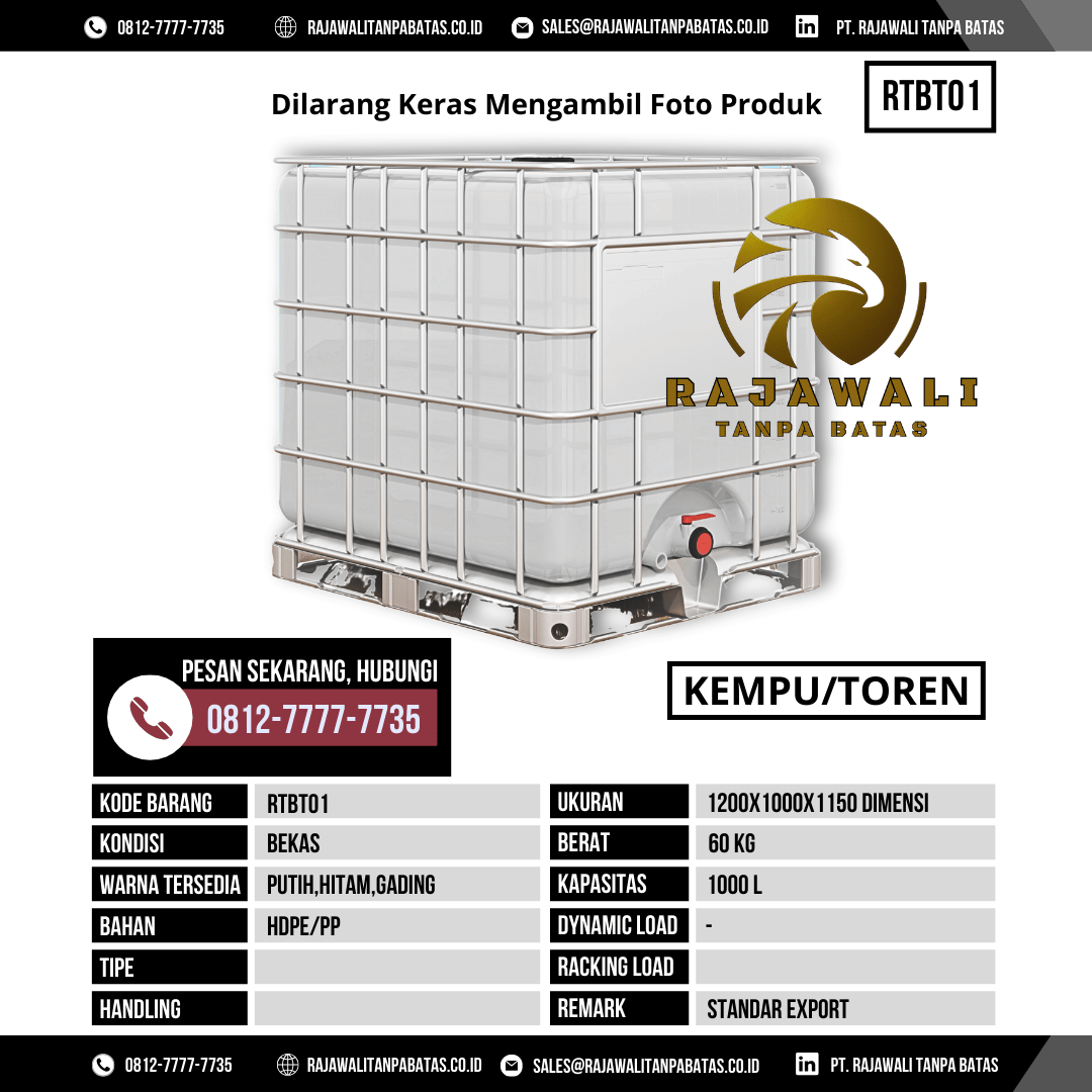 Dalam kegiatan industri, pergudangan, hingga proyek berskala besar, kebutuhan akan wadah penyimpanan cairan yang kuat, higienis, dan berkapasitas besar menjadi faktor penting dalam menunjang kelancaran operasional. Menjawab kebutuhan tersebut, PT Rajawali Tanpa Batas menghadirkan Kempu/Toren Bekas & Baru RTBT01, solusi tandon plastik berkualitas tinggi yang dirancang untuk penggunaan jangka panjang dengan harga yang kompetitif.