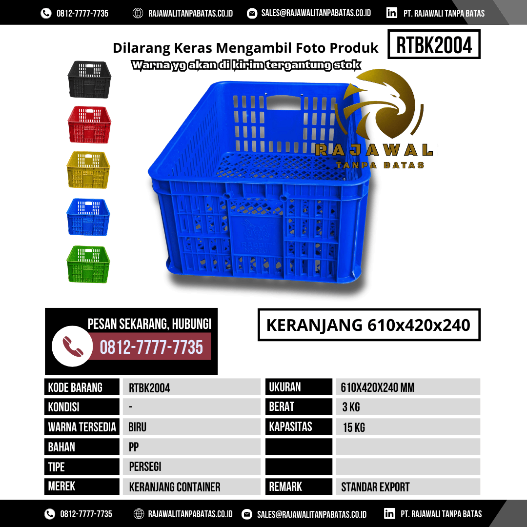 . Dengan pelayanan cepat, stok selalu tersedia, dan produk berkualitas, PT Rajawali Tanpa Batas menjadi mitra terpercaya dalam penyediaan Keranjang Plastik RTBK2004 untuk seluruh wilayah Indonesia maupun kebutuhan ekspor internasional.