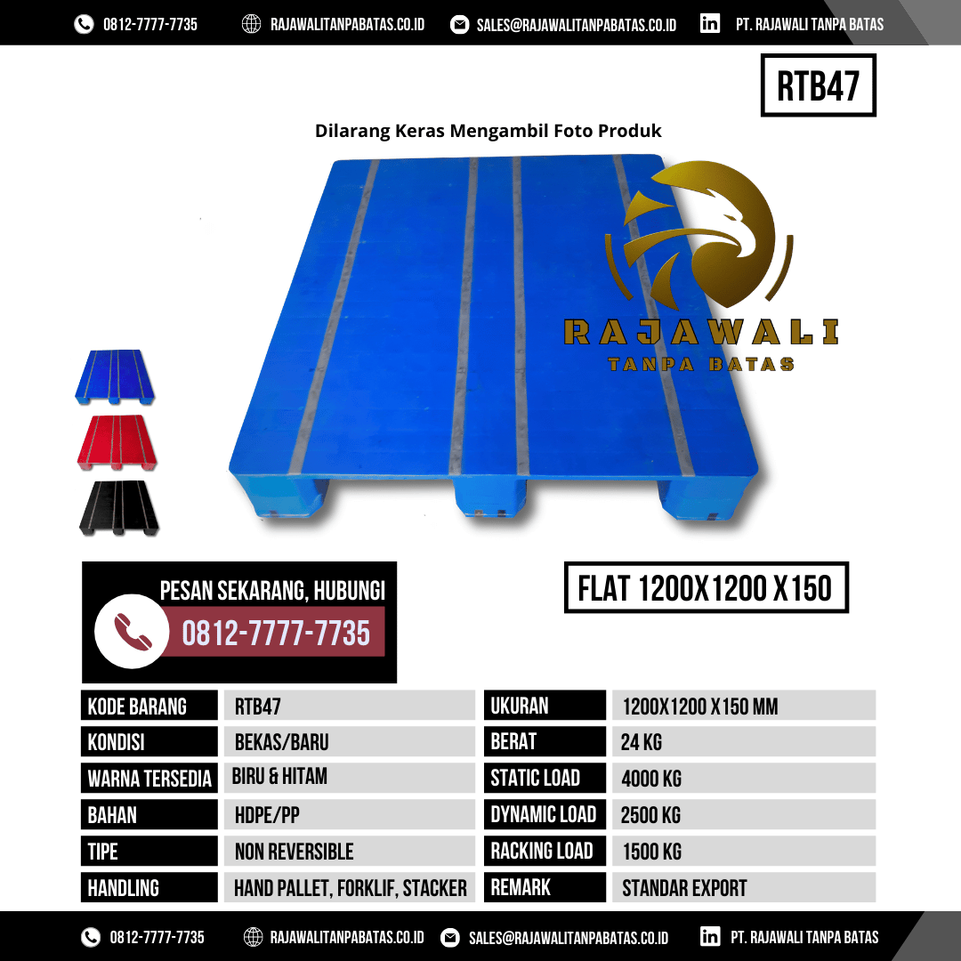 Dalam dunia logistik dan pergudangan, keberadaan pallet yang tepat bukan hanya soal alat bantu penyimpanan, tetapi juga kunci efisiensi, keamanan, dan produktivitas operasional. PT Rajawali Tanpa Batas, sebagai penyedia pallet plastik terpercaya, menghadirkan solusi ideal melalui Pallet Plastik Bekas & Baru RTB47. Produk ini dirancang untuk memenuhi kebutuhan industri modern yang mengutamakan kualitas, kekuatan, dan harga yang bersaing.