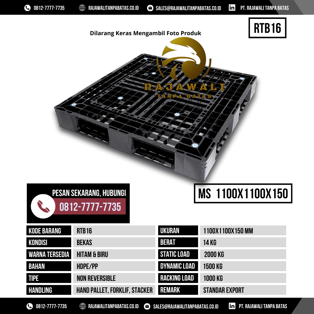 PT Rajawali Tanpa Batas hadir sebagai solusi terpercaya dalam penyediaan pallet plastik berkualitas untuk berbagai kebutuhan industri dan pergudangan. Dengan komitmen menyediakan pallet bekas maupun baru yang aman, kuat, dan tahan lama, perusahaan kami memastikan setiap produk mendukung efisiensi operasional logistik Anda. Salah satu produk unggulan kami adalah Pallet Plastik RTB16 berukuran 1100x1100x150 mm dengan model jaring berwarna hitam, siap memenuhi kebutuhan penyimpanan dan distribusi barang dengan standar kualitas tinggi.