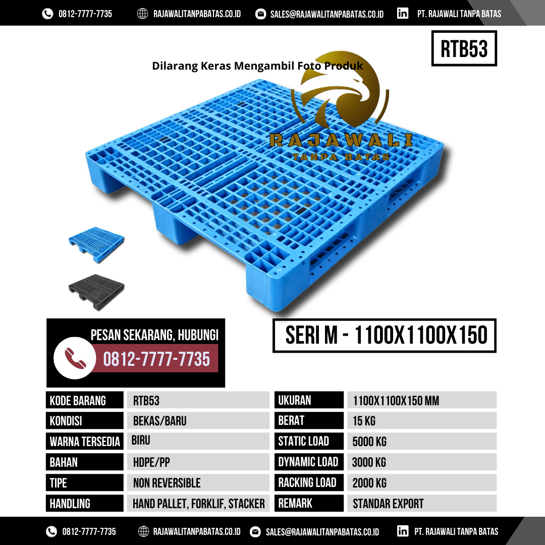 Pallet Plastik RTB53 – Biru adalah solusi terbaik untuk perusahaan yang membutuhkan pallet berkualitas tinggi, tahan banting, dan higienis dengan harga terjangkau. Dengan material HDPE/PP, model jaring fungsional, kemampuan menahan beban tinggi, dan berbagai keunggulan tambahan, pallet ini mendukung efisiensi, keamanan, dan produktivitas operasional gudang dan distribusi barang. Pilih RTB53 untuk memastikan keamanan barang, efisiensi ruang, dan kelancaran operasional logistik di seluruh wilayah Indonesia.