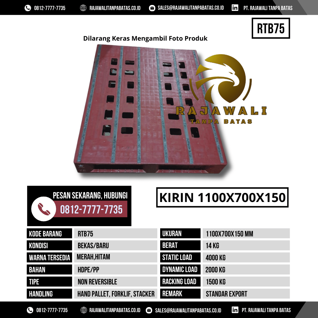 Dalam dunia industri dan logistik, pemilihan pallet yang tepat sangat menentukan efisiensi operasional, keamanan barang, dan kelancaran distribusi. PT Rajawali Tanpa Batas menghadirkan solusi unggulan melalui Pallet Plastik Bekas & Baru RTB75 – Merah, yang dirancang khusus untuk memenuhi kebutuhan berbagai sektor industri dengan kualitas tinggi, harga kompetitif, dan layanan profesional.