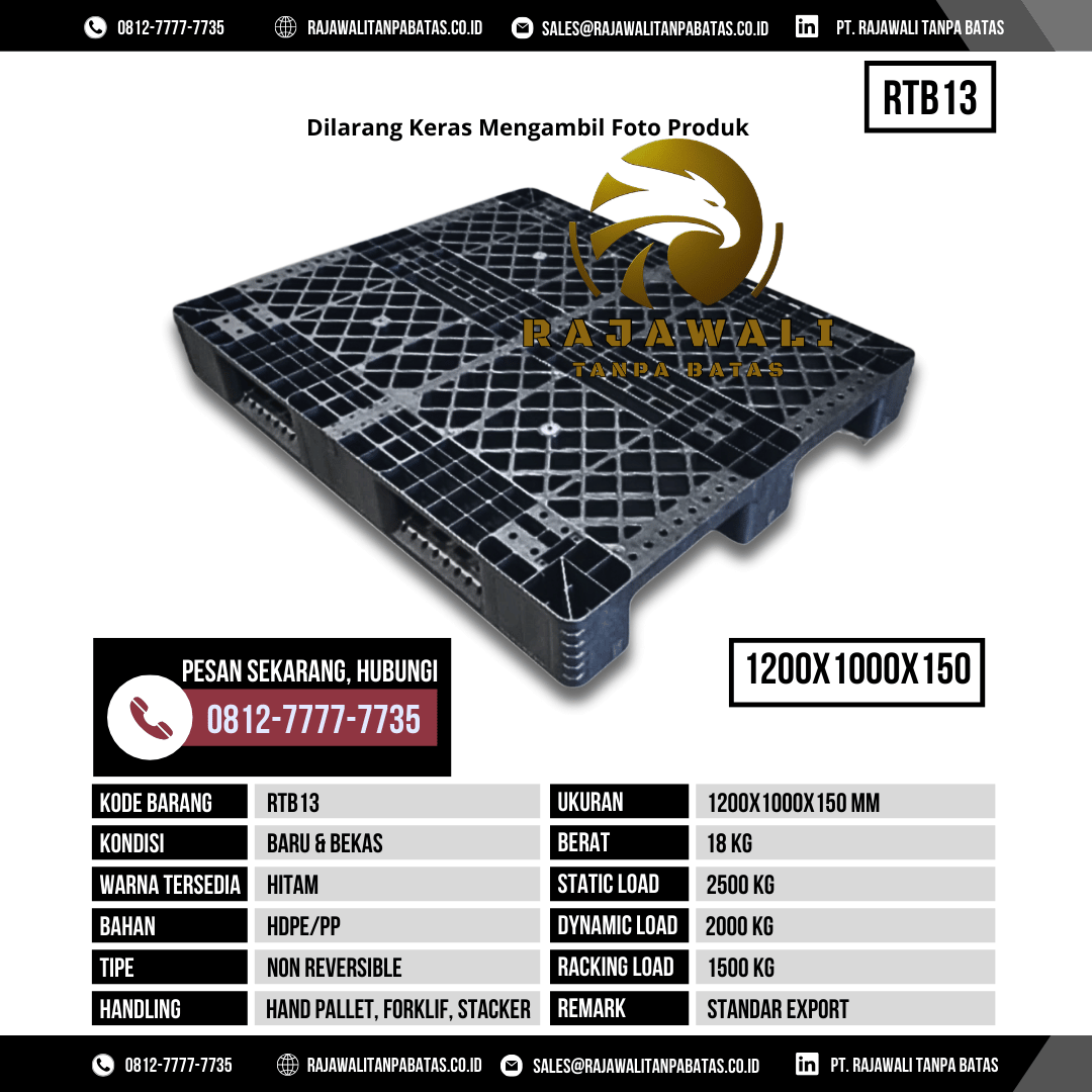 PT Rajawali Tanpa Batas menghadirkan solusi unggul untuk kebutuhan industri dan logistik melalui Pallet Plastik RTB13. Dirancang untuk memberikan ketahanan, keamanan, dan efisiensi, pallet ini cocok untuk berbagai sektor, mulai dari pergudangan, distribusi, manufaktur, hingga industri makanan dan minuman. Dengan kualitas terjamin, harga kompetitif, serta layanan cepat, RTB13 menjadi pilihan utama bagi perusahaan yang mengutamakan performa dan keandalan.