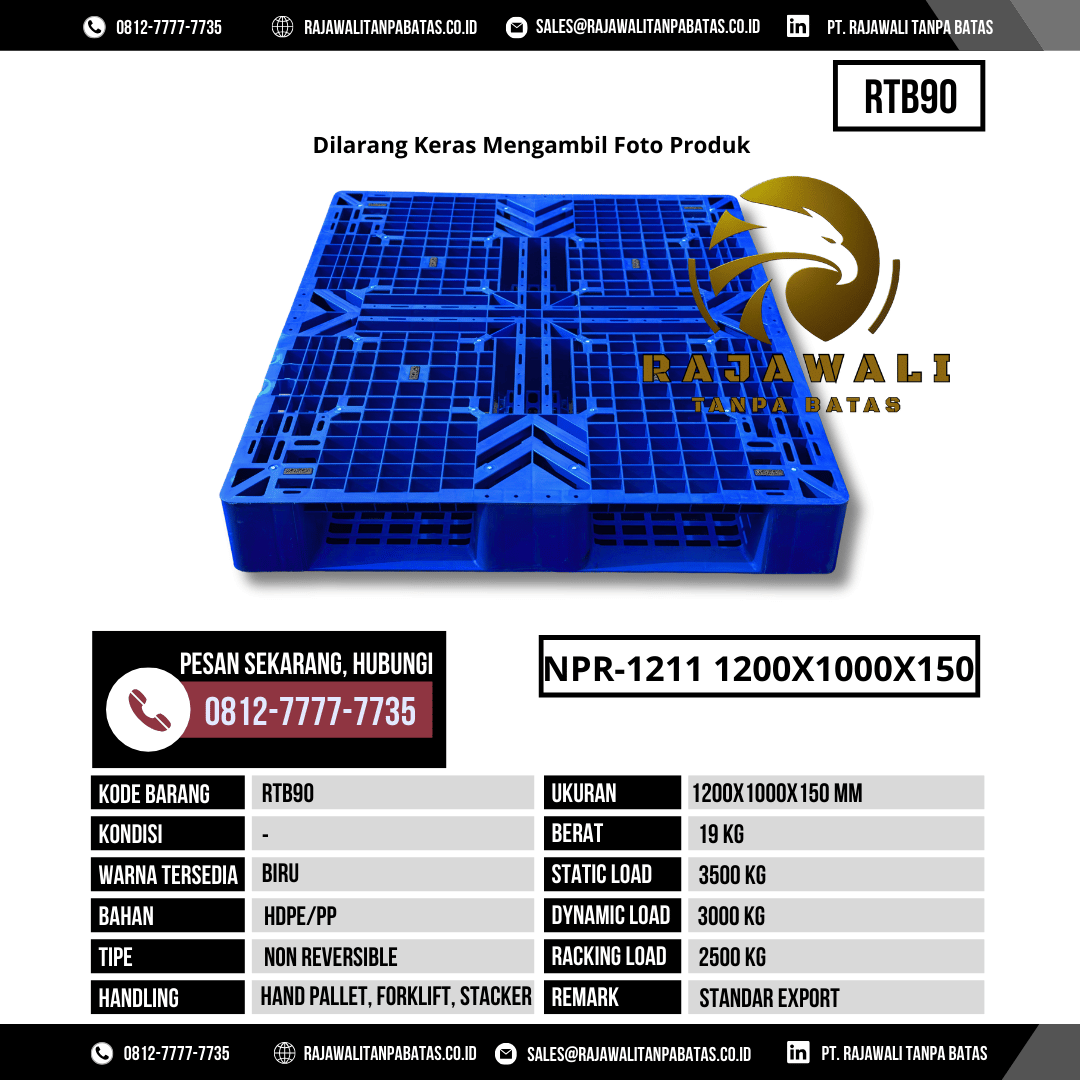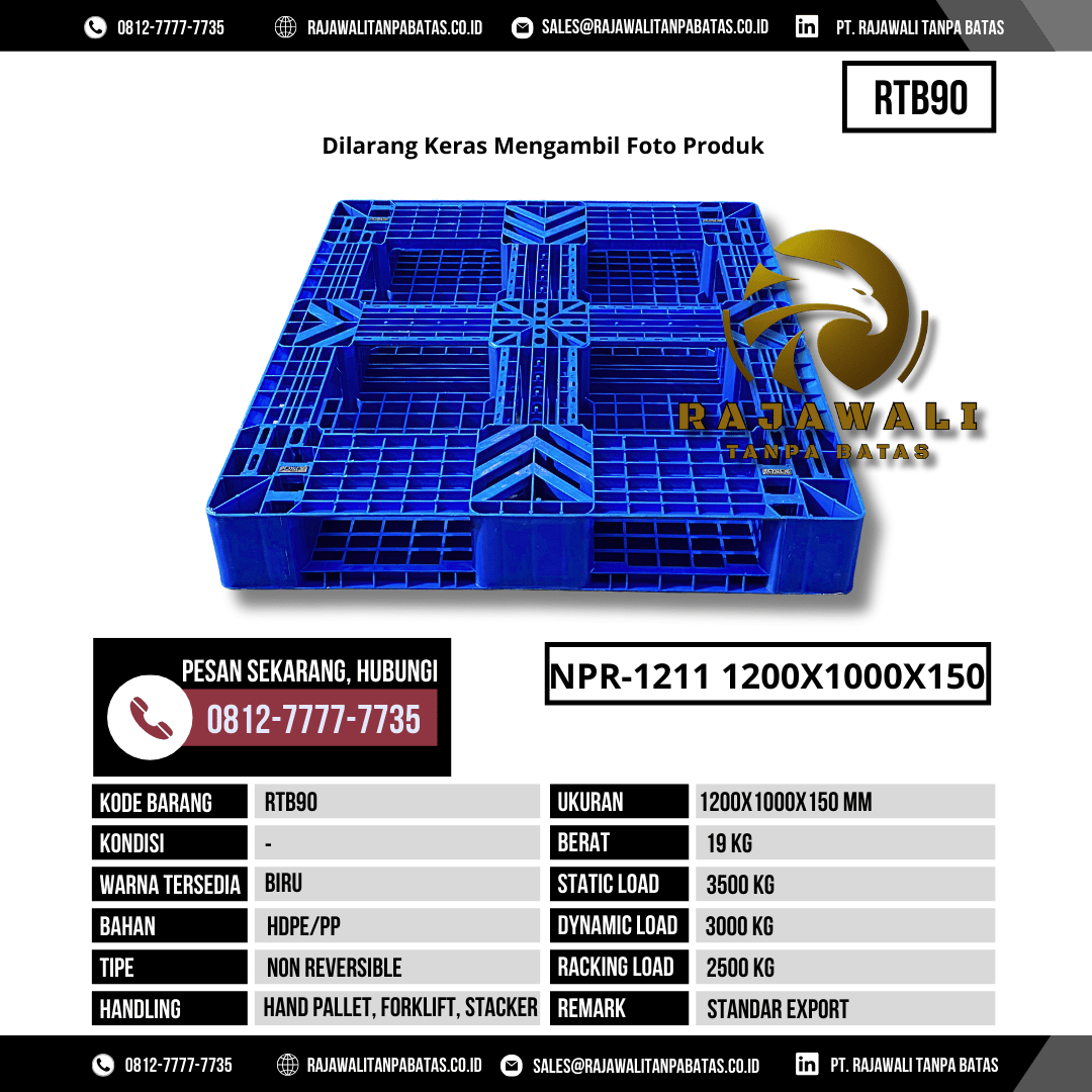 Dalam kegiatan logistik, pergudangan, dan distribusi barang, penggunaan pallet yang tepat sangat berpengaruh terhadap efisiensi operasional dan keamanan produk. PT Rajawali Tanpa Batas, perusahaan yang bergerak di bidang penjualan pallet plastik bekas dan baru dengan kualitas terjamin serta harga terjangkau, menghadirkan Pallet Plastik RTB90 ukuran 1200x1000x150 mm warna biru sebagai solusi andal untuk berbagai kebutuhan industri.