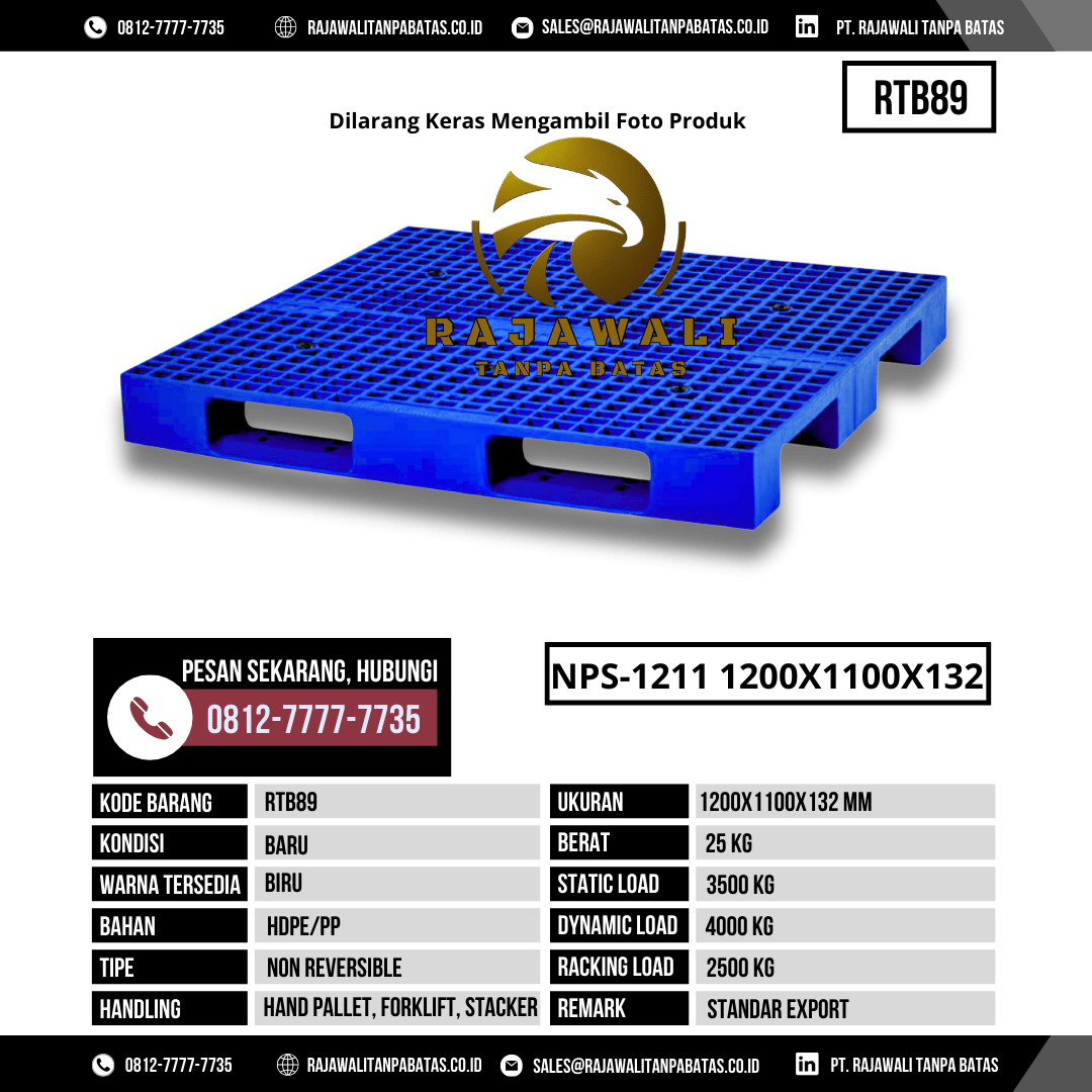 Dalam aktivitas logistik, pergudangan, dan distribusi modern, penggunaan pallet yang kuat, higienis, dan efisien merupakan faktor penting untuk menjaga kelancaran operasional. PT Rajawali Tanpa Batas, perusahaan yang bergerak di bidang penjualan pallet plastik bekas maupun baru dengan kualitas dan pelayanan terbaik, menghadirkan Pallet Plastik RTB89 ukuran 1200x1100x132 mm warna biru sebagai solusi andal untuk berbagai kebutuhan industri.