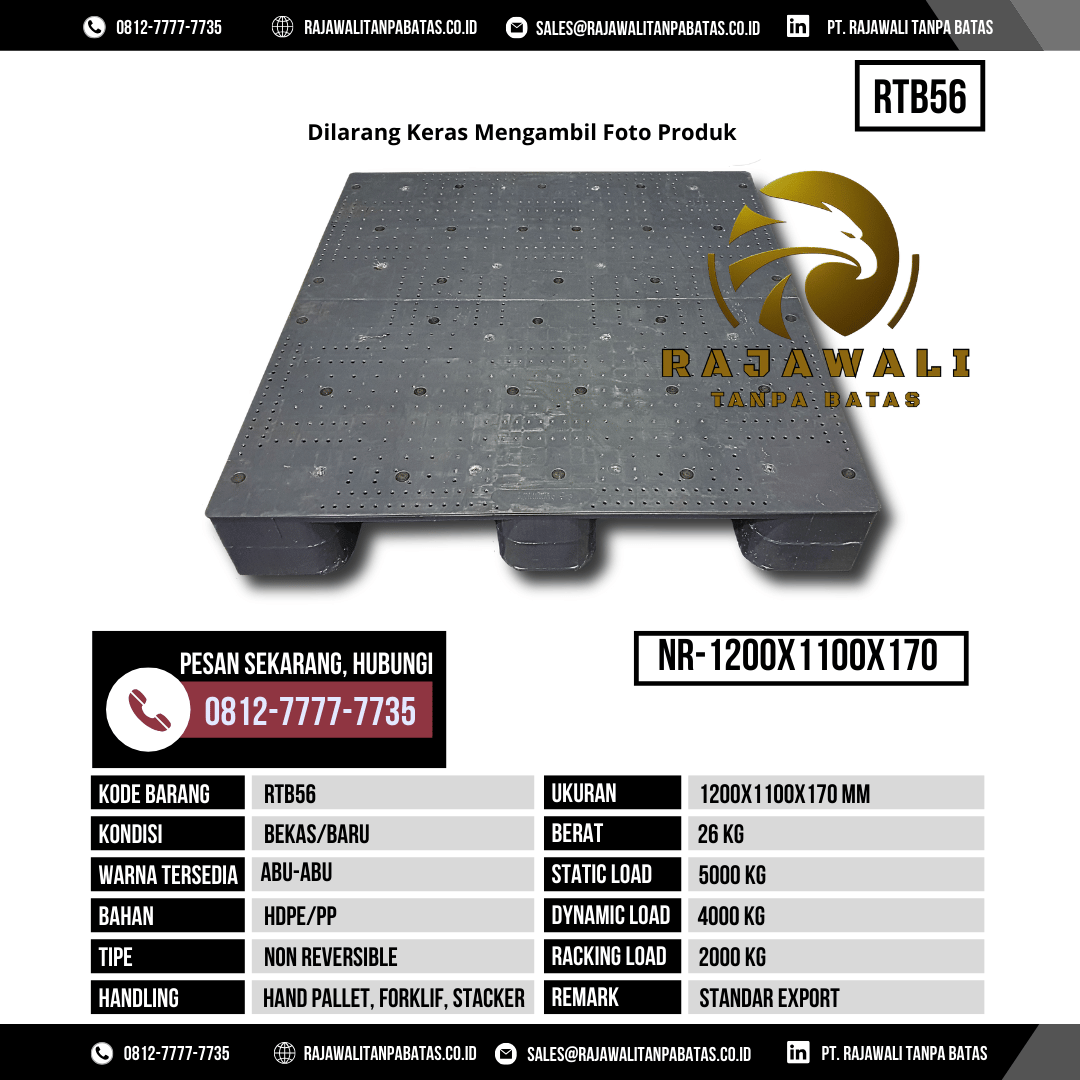 Pallet RTB56 memiliki ukuran 1200x1100x170 mm, dimensi ideal untuk berbagai kebutuhan logistik dan pergudangan. Terbuat dari bahan HDPE/PP (High-Density Polyethylene / Polypropylene), pallet ini tahan lama, kuat, dan tidak mudah pecah, sehingga mampu menahan beban berat tanpa mengurangi stabilitas. Tipe Non Reversible memberikan kemudahan dalam penataan barang dan menjaga kestabilan pallet saat digunakan, baik untuk penyimpanan maupun pengiriman.