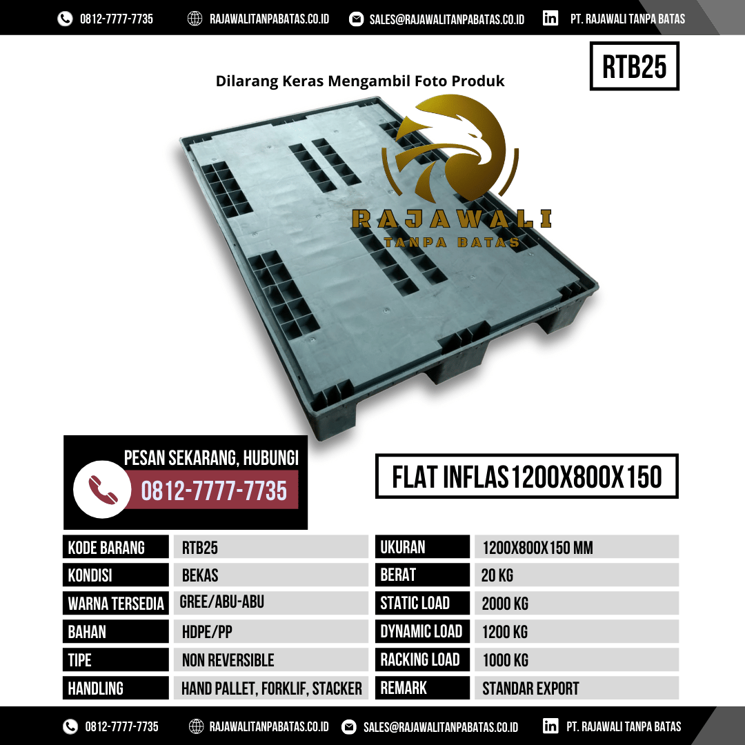 PT Rajawali Tanpa Batas selalu memastikan stok pallet siap dikirim (ready stok) ke seluruh wilayah Indonesia. Dengan harga terjangkau dan kualitas yang kuat, tahan banting, serta memenuhi standar ekspor, pallet RTB25 menjadi pilihan cerdas bagi perusahaan yang mengutamakan efisiensi, keamanan, dan produktivitas operasional.
