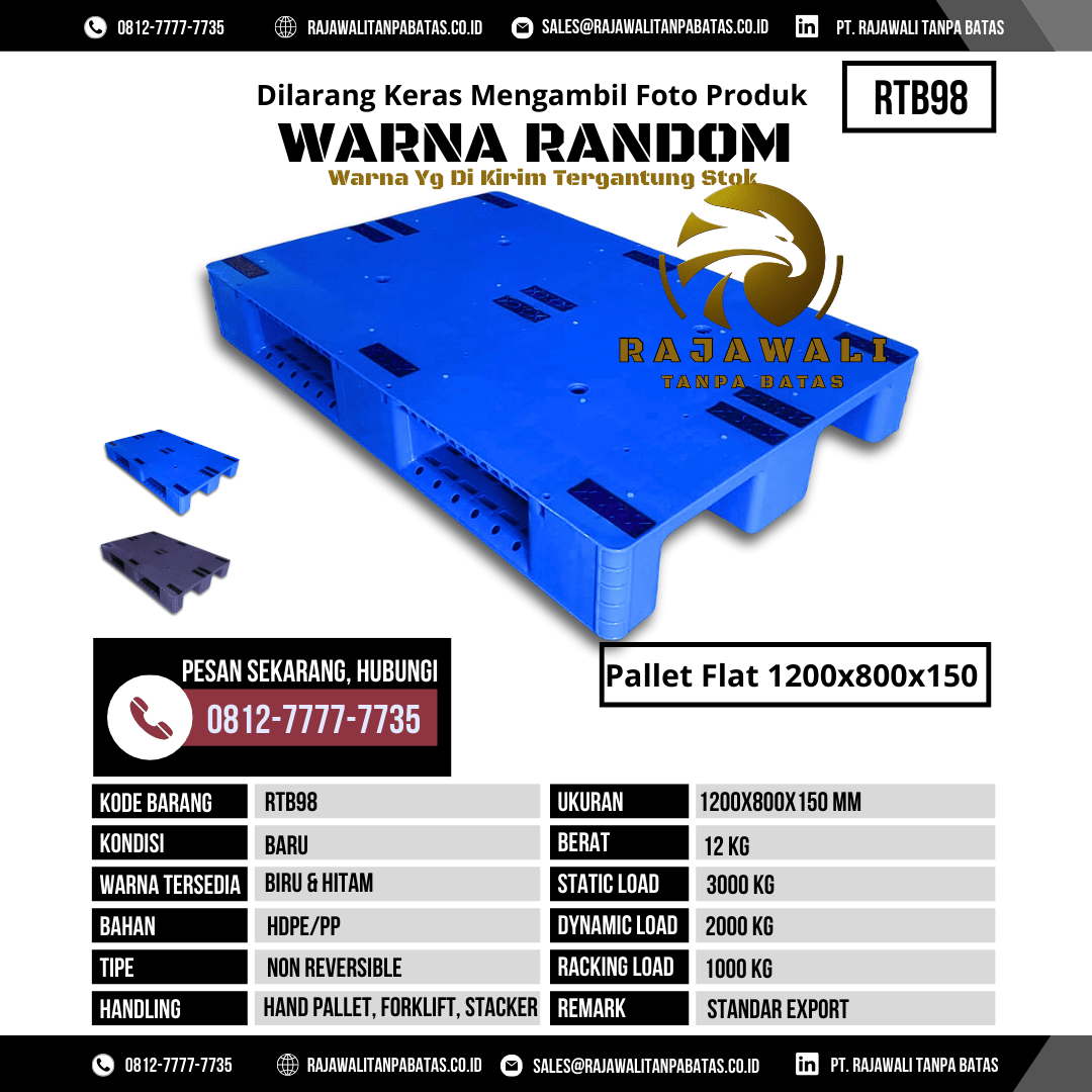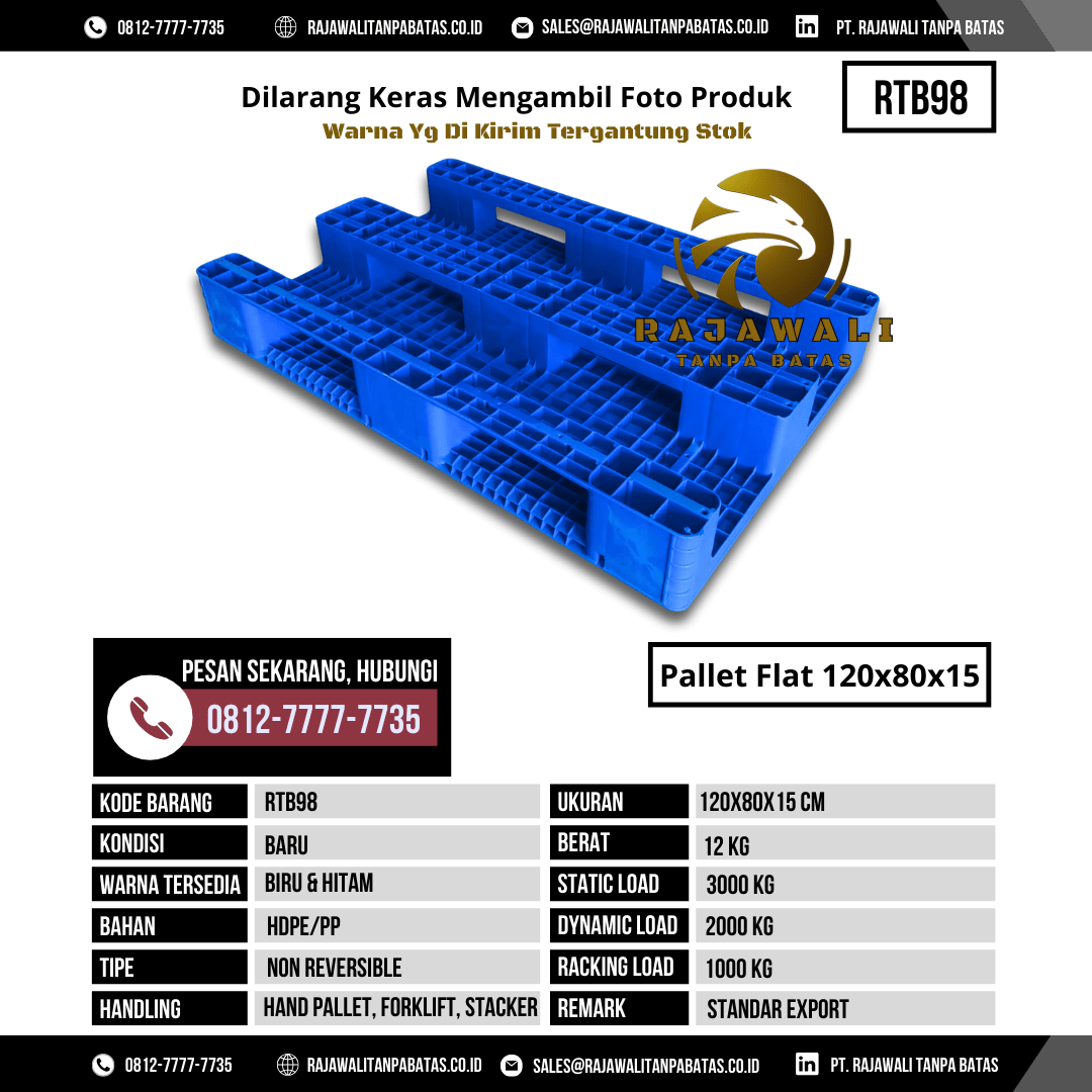Dalam dunia logistik, pergudangan, dan distribusi barang, pemilihan pallet yang tepat menjadi faktor penting untuk menjaga keamanan produk sekaligus meningkatkan efisiensi operasional. PT Rajawali Tanpa Batas, perusahaan yang bergerak di bidang penjualan pallet plastik bekas maupun baru, menghadirkan Pallet Plastik RTB98 ukuran 1200x800x150 mm warna biru sebagai solusi pallet yang kuat, higienis, dan ekonomis untuk berbagai kebutuhan industri.